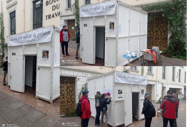 Le 15 novembre nous avons installé la cellule (identique en superficie – 9m2 – à celle d’un détenu incarcéré en prison) – cellule dans laquelle les détenus sont de plus en plus nombreux – 3 personnes voire 4 (le cas d’une cellule à Angers).